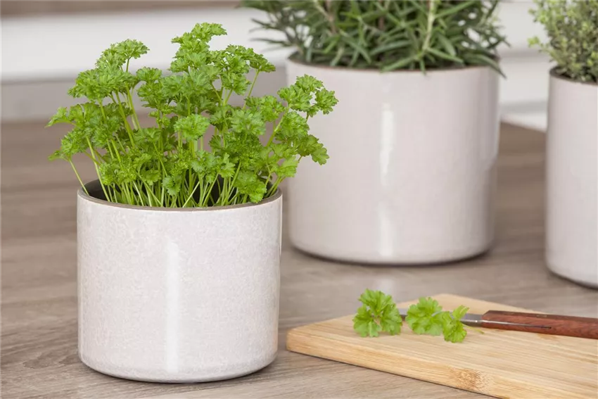 Petroselinum crispum 'Mooskrause 2' Die meisten Küchenkräuter wachsen und entwickeln sich im Laufe der Zeit, wobei die einjährigen Pflanzen oft schneller wachsen als die mehrjährigen Kräuter. Etwas Platz benötigen sie jedoch alle, um sich ausbreiten und entfalten zu können. Damit die Küchenkräuter nicht zu eng beieinanderstehen, was auch eher zu Krankheiten oder Schädlingsbefall führen kann, empfiehlt es sich, die Kräuter in einzelne Pflanzgefäße zu pflanzen und dann an das Fenster zu stellen. Besonders schön sieht es aus, wenn die einzelnen Töpfchen dann nebeneinander in einem kleinen Korb oder auf einem hölzernen Tablett stehen. Gerade die mediterranen Pflanzen wirken in kleinen Terracotta-Töpfchen ausgesprochen schick. Schließlich isst ja bekanntermaßen das Auge von Anfang an mit.
