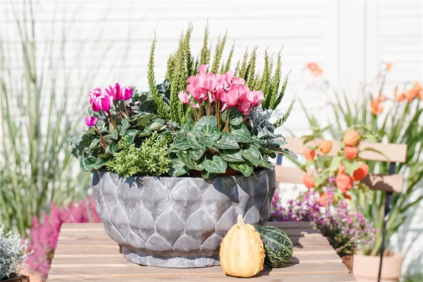 Cyclamen persicum 'Out-Land'® Auf hohe Rollen gestellt und mit einer dekorativen Platte versehen, können Sie einen alten Blumenkübel auch zu einer neuen Rolle als Truhentisch in Ihrem Garten verhelfen. Dabei spielt es keine Rolle, ob es sich um einen runden oder eckigen Kübel handelt, passen Sie einfach Ihre Tischplatte entsprechend an. Und wenn Ihnen das Äußere Ihres Kübels gar nicht mehr gefallen sollte, so können Sie mit Folien, Leisten, Stöckchen, Kieseln, Fliesenbruch, Spiegeln und vielen anderen Materialien sehr viel bewirken. Zum Befestigen können Sie, je nach Material Heißkleber, Fliesenkleber, Schmuckkordeln und -Bänder oder auch Draht verwenden. Selbst Bast und Streifen aus Kunststofftüten können kreative Akzente setzen.