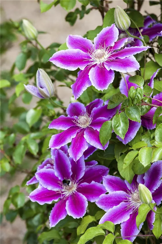 Clematis Einen Hang ins Rätselhafte bringt die Farbe Violett mit. Die große Blüte der Clematis ist wie geschaffen für magische Gartenecken. Das aus der gleichen Farbfamilie stammende Pink leuchtet stärker und wirkt ungemein attraktiv, wie man bei Malven gut sehen kann. Effektvolle, harmonische und unübersehbare Kombinationen ergeben sich mit zartem Gelb und Orange. Lila ist anpassungsfähig und in viele Arrangements integrierbar. Ein Beispiel ist der kugelige Zierlauch.