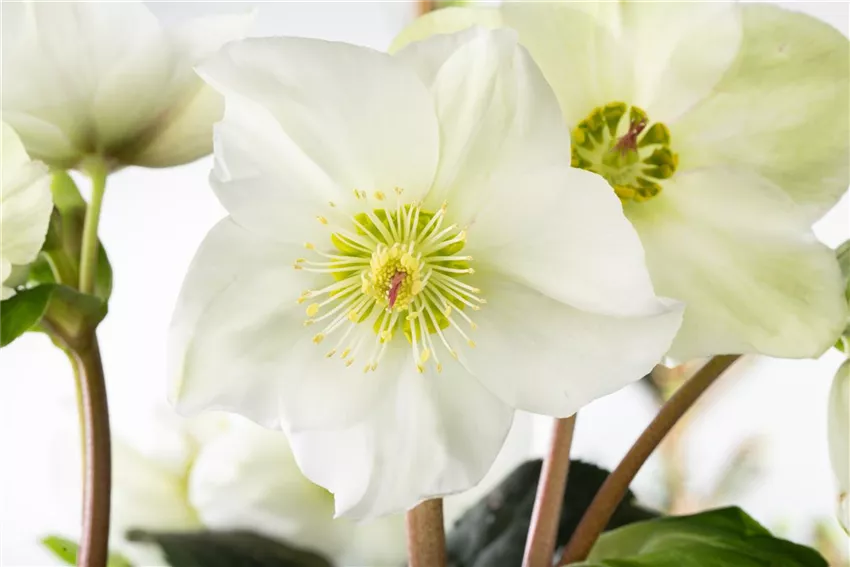 Helleborus Hybride 'Spring Promise Conny' Wer schon früh im Jahr mit hübschen Blüten starten will, der kann mit Christrosen für gute Laune sorgen. Denn die Blüten der Stauden zeigen sich je nach Sorte schon Im Dezember und blühen dann später zusammen mit den ersten Frühlingsboten um die Wette. Vor allem neben Schneeglöckchen und Winterlingen sehen sie besonders hübsch aus und zeigen, dass der Winter nicht immer grau und trist sein muss. Die frühe Blütezeit ist es auch, die die Pflanzen im Haus zu Weihnachten so beliebt machen. Das macht sie auch zur wahren Christrose, denn der Name spricht für sich. Die weißen Blüten passen perfekt in den Winter und sind in Haus und Garten hübsch anzusehen. Die im Frühling blühenden Arten werden als Lenzrosen oder Nieswurzen bezeichnet. Die Christrosen aber sind es, die im Winter für Highlight sorgen. Die wintergrünen Stauden sind mehrjährig und werden von Jahr zu Jahr schöner. Schließlich können die Pflanzen am passenden Standort und mit der richtigen Pflege schnell mal 25 Jahre alt werden. Damit das auch so bleibt, ist auch die Pflege der Pflanzen entscheidend. Insgesamt sind die Stauden aber sehr pflegeleicht und bedanken sich für die nötige Aufmerksamkeit dann im Winter mit hübschen und besonders eleganten Blüten.